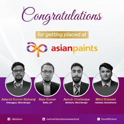 DBS Global University proudly announces that Asian Paints has selected Adarsh Kumar Maharaj, Raja Kumar, Aviruk Chatterjee, and Mitul Brijwasi through its recent campus placement drive.